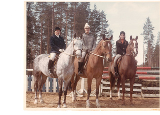 Hevoset olivat virkeitä. Totesimme kahden kilometrin kävelyn jälkeen, että ravi oli aika epämiellyttävää, koska emme osanneet keventää. Laukka oli miellyttävämpää, koska siinä ei tärissyt niin paljon. Laukassa oli vain yksi huono puoli: sitä ei saanut aina loppumaan ja joskus hevoset innostuivat kilpailemaan. Muutaman kerran puolukanpoimijat juoksivat nopeasti pakoon puolukoiden lentäessä ympäriinsä, kun kolme ratsukkoa tuli täyttä vauhtia. Emme voineet tehdä muuta kuin huutaa: pois alta. Pysyimme kuitenkin satulassa. Aika pian opimme keventämään ja hallitsemaan paremmin hevosiamme. Ratsastuskerrat olivat aina noin kahden tunnin maastolenkkejä ilman opettajaa. Kypärän käyttö ei ollut pakollista eikä meillä niitä ollut.